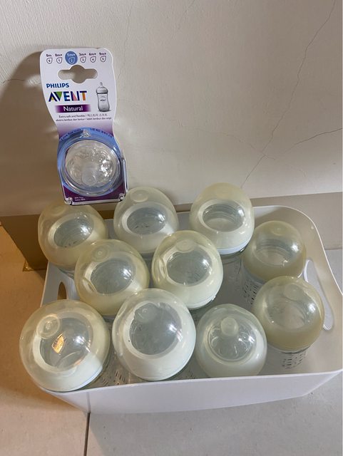 總共 :7支240ml 、3支120ml 、兩個全新奶嘴頭、加一個只使用一次消毒過的奶嘴頭