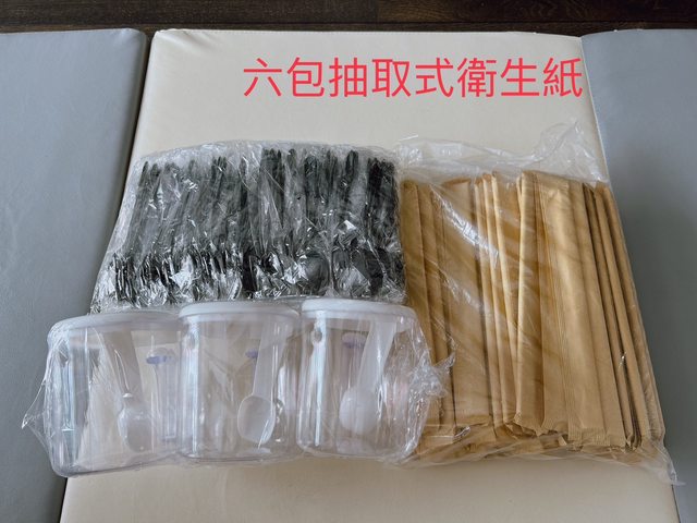 3.全新竹筷(大約100雙)+塑膠湯匙(大約100支)+調味罐*3,換六包抽取式衛生紙