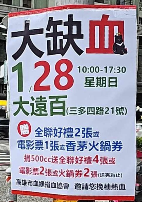 標題[閒聊] 1月27日大遠百捐血