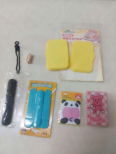 e.雜物(電線收納+濕紙巾可重複用盒蓋+手機用支架+便條紙+小鏡子
