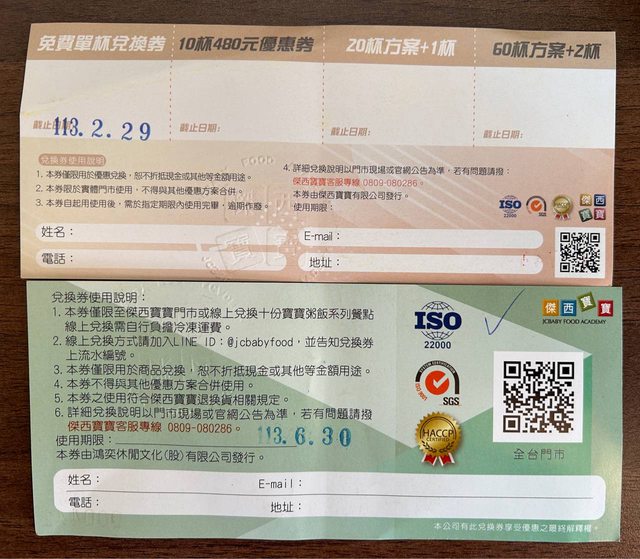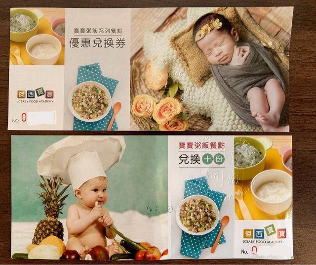 物品名稱:傑西寶寶粥飯餐點兌換卷(一張可換10份)+優惠卷(不選擇優惠也可以換一