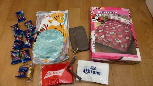 物品名稱:全新雙人床包組、加油棒、零錢包、全聯贈送玩具一批、前年虎年的燈籠