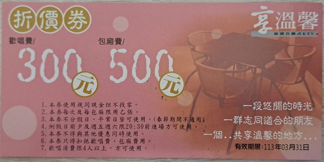 物品名稱:享溫馨折價券乙張 期限到3/31