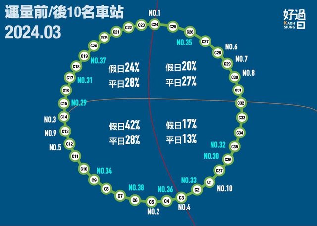最高10站:C24愛河之心、C5夢時代、C14哈瑪星、C3前鎮之星、C12駁二大義、C28高雄高工