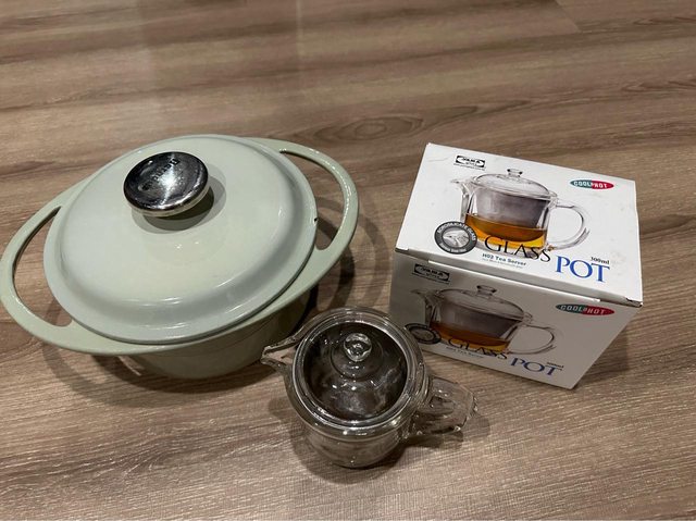物品名稱:淺綠色寶迪鑄鐵鍋及二手泡茶壺
