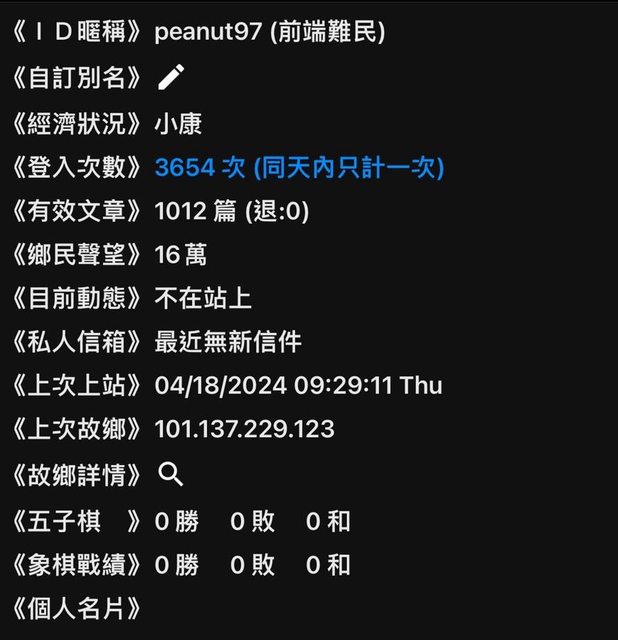 《登入次數》3658 次 (同天內只計一次) 《有效文章》1012 篇 (退:0)
