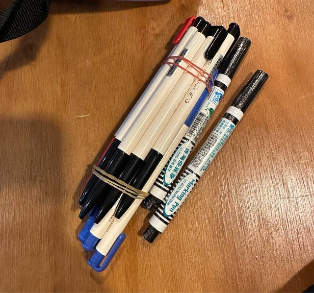 : 今天傍晚到左營高鐵站這邊吃飯,賣筆阿伯就坐在高鐵旁捷運入口處,有很多種筆還有