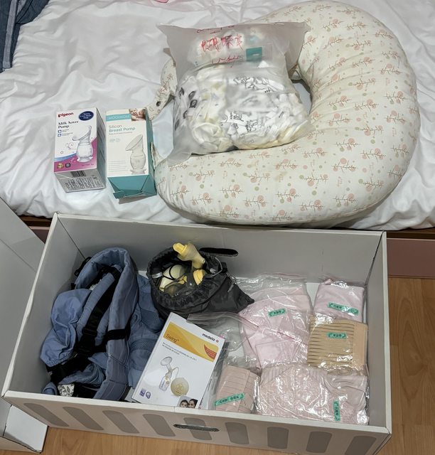 (芬蘭箱含蓋、哺乳枕、單邊電動擠乳器、手動集乳瓶、束腹帶多款、揹巾、紗布衣多件)