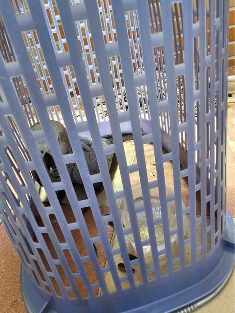 高雄朋友家前二天陽台飛來了一隻灰鸚,今天第三天朋友有用洗衣籃蓋起來,朋友沒有養