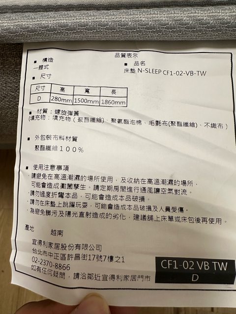 2、宜得利標準雙人床墊,型號如照片