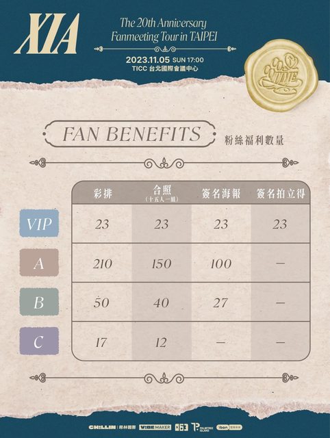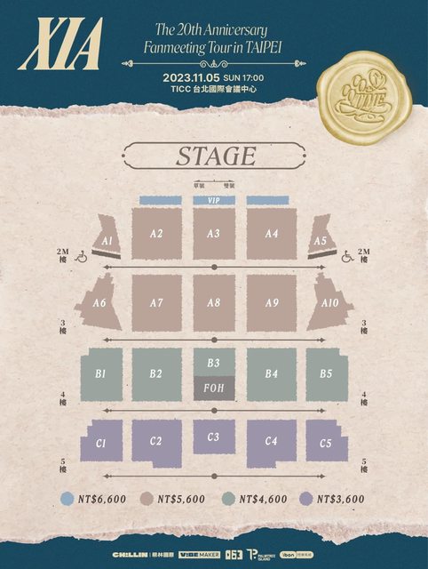 【 XIA Fanmeeting Tour in TAIPEI <COCOTIME>: The 20th anniversary 】 活動日期:2023 年 11 月 05 日(日) 演出時間:17:00 (實際演出時間以現場公告為準) 演出地點:TICC 台北國際會議中心 (台北市信義區信義路五段1號) 啟售時間:2023 年 09 月 30 日(六)15:00 售票系統:全台7-11 ibon 機台及 ibon 網站 售票網站:網站建檔中 https://i.imgur.com/vkG4BH2.jpg