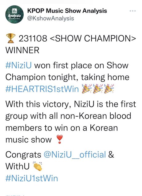 今天在韓國出道9天的NiziU 在Show Champion 拿下一位 達成了全外國人團體在韓國音放史上的第一個一位 https://i.imgur.com/NwGKesE.jpg