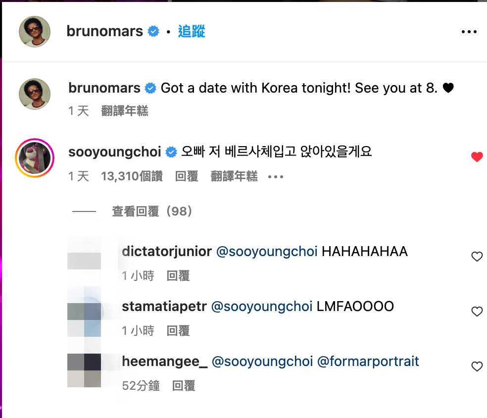 → replyrose: 23年Bruno Mars韓國演唱會,秀英也是 49.215.25.187 10/25 12:54