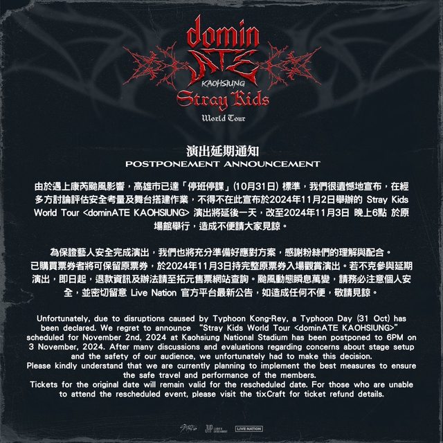 由於遇上康芮颱風影響,高雄市已達「停班停課」(10月31日) 標準,我們很遺憾地宣布 ,在經多方討論評估安全考量及舞台搭建作業,不得不在此宣布於2024年11月2日舉辦的 Stray Kids World Tour <dominATE KAOHSIUNG> 演出將延後一天,改至2024年11月3日 晚上6點 於原場館舉行,造成不便請大家見諒。 爲保證藝人安全完成演出,我們也將充分準備好應對方案,感謝粉絲們的理解與配合。已 購買票券者將可保留原票券,於2024年11月3日持完整原票券入場觀賞演出。若不克參與 延期演出,即日起,退款資訊及辦法請至拓元售票網站 查詢( https://tixcraft.com/ne ws/detail/1064 )。 颱風動態瞬息萬變,請務必注意個人安全,並密切留意 Live Nation 官方平台最新公告 。 如造成任何不便,敬請見諒。 https://www.instagram.com/p/DBv7i5CTu3T/ -- ※ 發信站: 批踢踢實業坊(www.ptt-website.tw), 來自: 223.137.149.59 (臺灣) ※ 文章網址: https://www.ptt-website.tw/KoreaStar/M.1730293143.A.82A