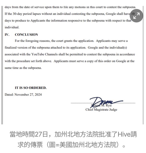 Ryu 法官表示,“我們允許發出此傳票請求,因為它不會過度侵入或造成負擔,並且只要