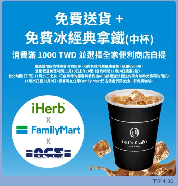 標題[情報] iherb 滿1000 全家取貨 送中冰拿