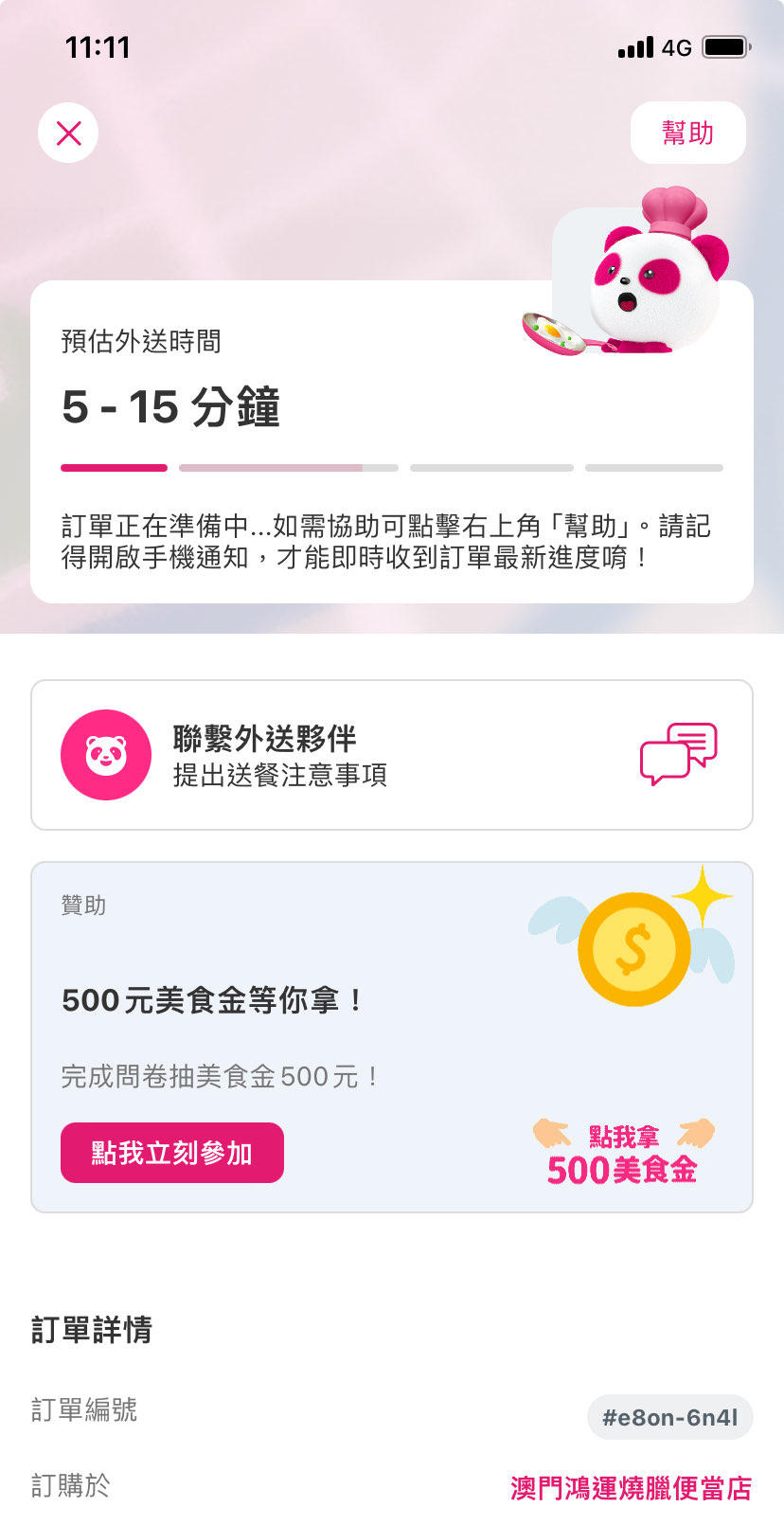 → cokecola: 下訂單成功熊貓不是會發訂單進度的通知? 36.228.140.125 11/02 22:34