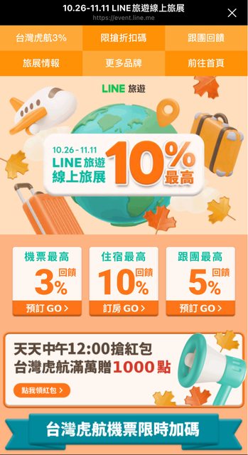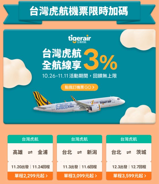 : 在line旅遊線上旅展期間(10/26-11/11)購買台灣虎航機票天天享3%點數回饋無上限