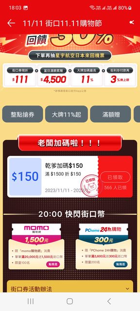 推 jim31117: 888-50也照用,1500-150也搶到,平日消 27.51.144.227 11/11 22:22