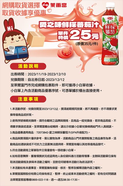 標題[情報] 萊爾富網購取貨 加購愛之味番茄汁優惠