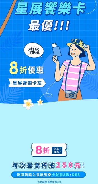 在折扣碼處輸入 信用卡前8碼+DBS 並使用該卡支付即可享有8折優惠(上限$250.最高6