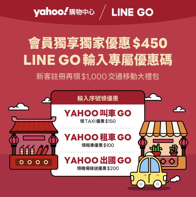 ▌活動內容:Yahoo 購物中心|LINE GO歲末年終年貨大街,會員獨享叫車、租車及機場接送三大限量好禮,輸碼最高拿 $450乘車優惠!