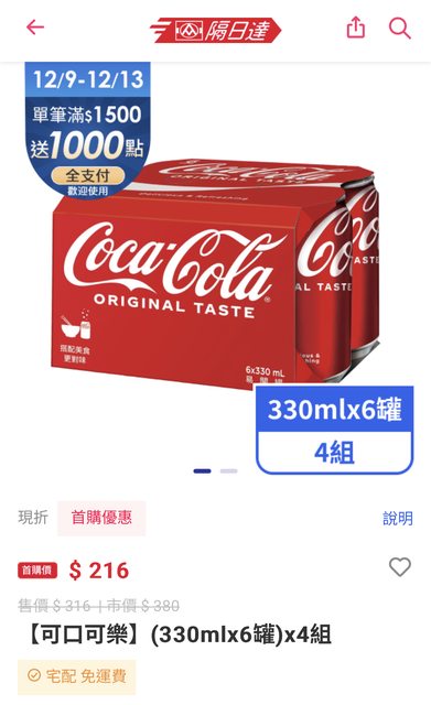 : 可口可樂330ml 24罐 折後$216(ZERO也有)
