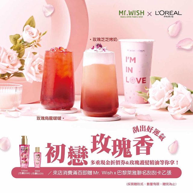 與全球美妝巨頭巴黎萊雅合作,推出2款玫瑰系列飲品,「玫瑰芝芝烤奶」與「玫瑰烏龍