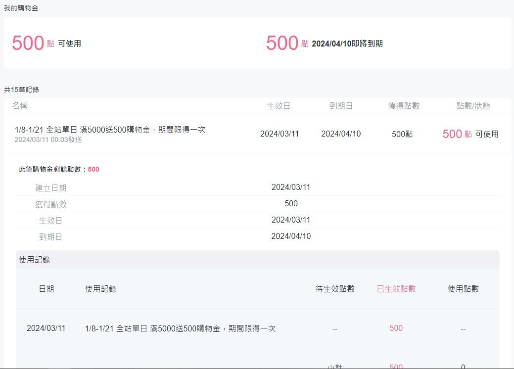 推 jay0215: 我的是500點,但要滿5000送500購物金 QAQ 118.167.218.22 04/08 15:01