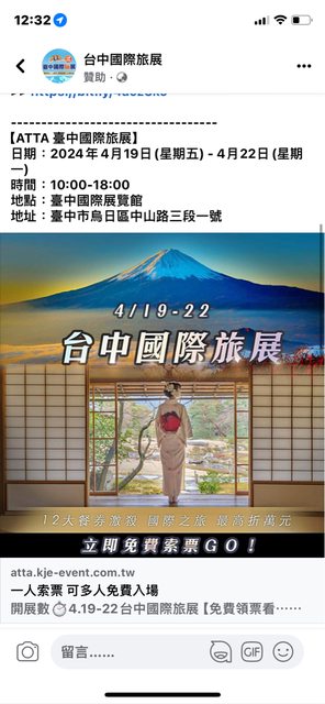 標題[情報] 4/19-22 ATTA台中國際旅展免費索票