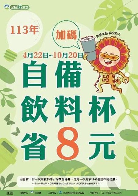 自備飲料杯至合作店家消費,享有8元折扣優惠;