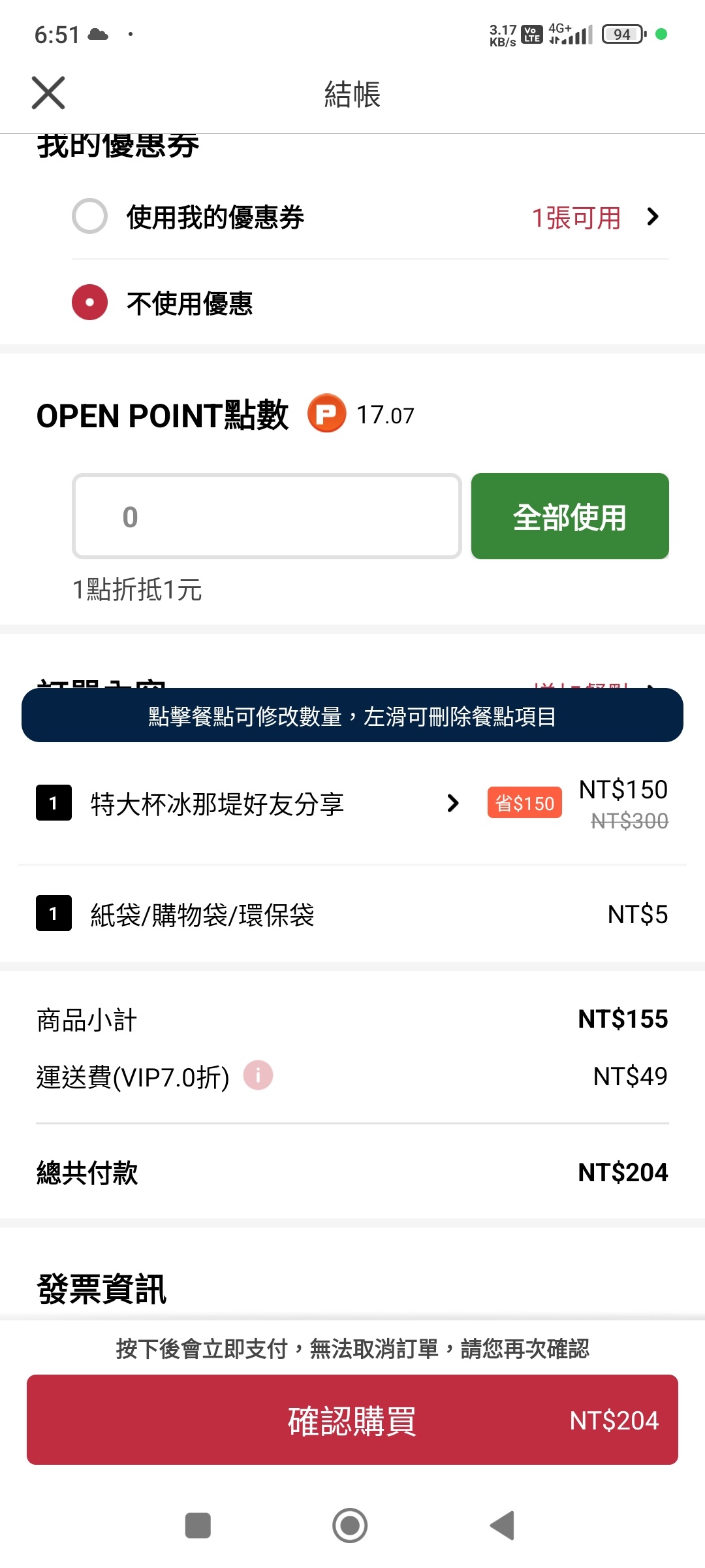 → crab1330: 在結帳那邊有顯示 (附圖)42.73.238.198 06/14 18:53