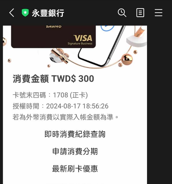 → birdy590: 我的卡有 line 即時通知 很容易對帳 119.14.42.10 09/12 09:57