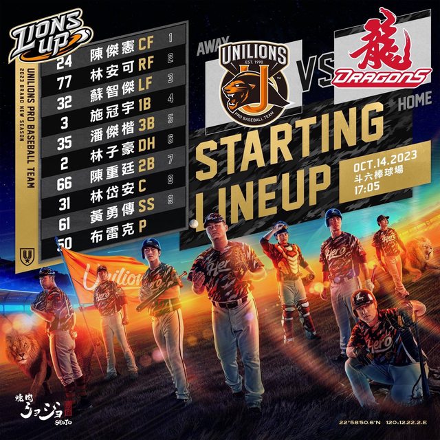 陳傑憲 CF 林安可 RF 蘇智傑 LF 施冠宇 1B 潘傑楷 3B 林子豪 DH 陳重廷 2B 林岱安 C 黃勇傳 SS 布雷克 SP -- ※ 發信站: 批踢踢實業坊(www.ptt-website.tw), 來自: 27.53.138.10 (臺灣) ※ 文章網址: https://www.ptt-website.tw/Lions/M.1697270431.A.D82