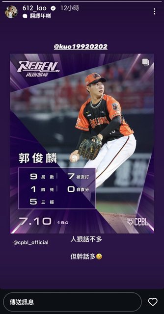 昨天統一面對味全的比賽,先發投手郭俊麟主投9局,被擊出7支安打,投出5次三振,只 有1次四壞球,只用了99球完投完封對手,拿下個人在中職生涯首場完投完封勝,而且也 是本季本土投手第一人。 古林在賽後分享了郭俊麟本場比賽中職的官方照片,並寫道: 人狠話不多 但幹話多 可以看出古林也相當推崇昨天瘋郭的優質表現 -- ※ 發信站: 批踢踢實業坊(www.ptt-website.tw), 來自: 101.8.33.106 (臺灣) ※ 文章網址: https://www.ptt-website.tw/Lions/M.1720673626.A.DC8