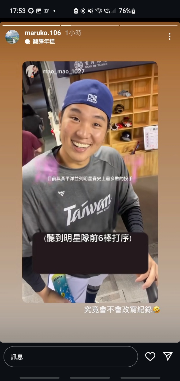 打第1棒,在明星賽能排上台灣隊先發感到很很榮幸,目前不會去想年底能否入選12強國