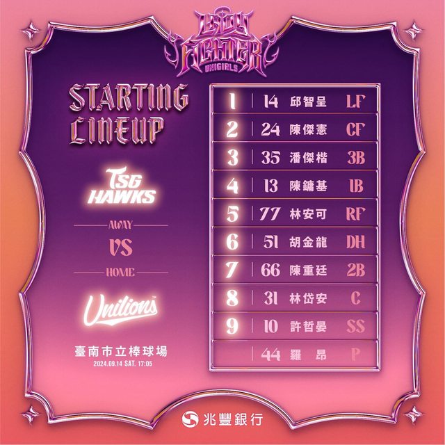 邱智呈 LF 陳傑憲 CF 潘傑楷 3B 陳鏞基 1B 林安可 RF 胡金龍 DH 陳重廷 2B 林岱安 C 許哲晏 SS 羅昂 SP -- ※ 發信站: 批踢踢實業坊(www.ptt-website.tw), 來自: 27.247.161.254 (臺灣) ※ 文章網址: https://www.ptt-website.tw/Lions/M.1726300930.A.6D9