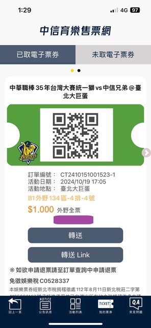 透過中信兄弟友人有季票的幫忙下購票