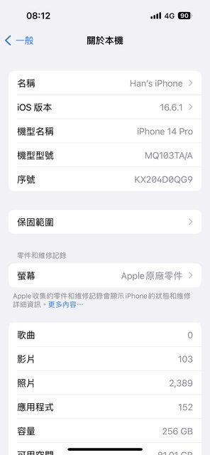 [規格] 銀色 256G 電力健康度89%