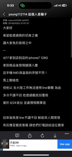 種小問題煩心,所以我要求跟對方溝通退貨。之後再次聯繫這位板友就已讀不回,電話不