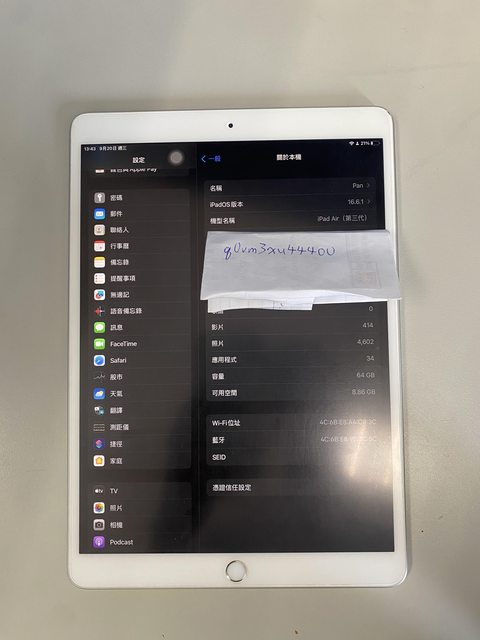 1. iPad Air 3, 沒有盒裝,螢幕有貼保護膜,書寫滑順,有充電器。