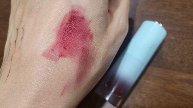 類似唇泥,霧面的,顏色類似盛開的薔薇,好看但不日常。上唇的感覺不會太乾,喜歡霧