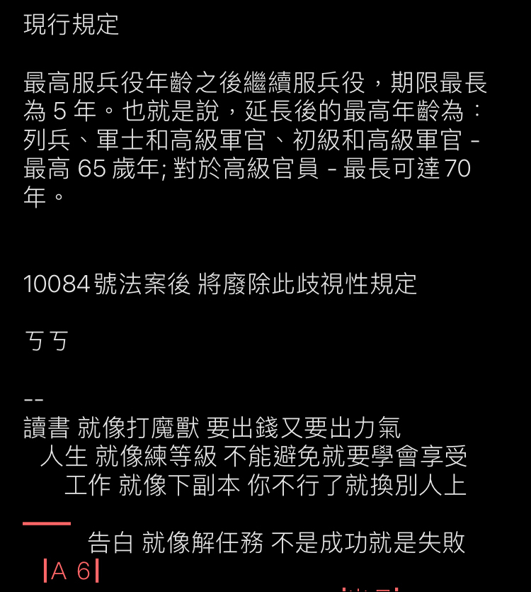 → test23786 : 年齡且意願的人繼續延長役期而已,結果被A6扭曲成 10/05 00:02