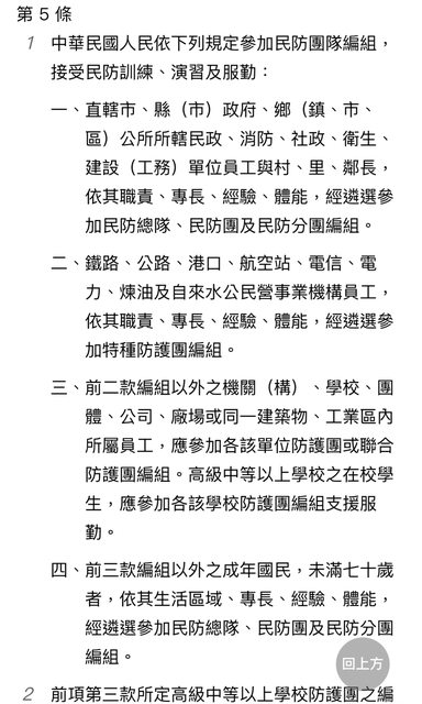 推 ntnusleep : 民防法第2條的民防工作範圍裡有"支援軍事勤務" 11/22 23:44