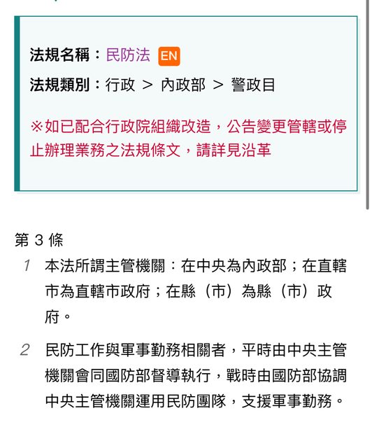 噓 h80733 : 民防法不熟嗎? 民防工作與軍事勤務相關者,平時由 11/22 21:43