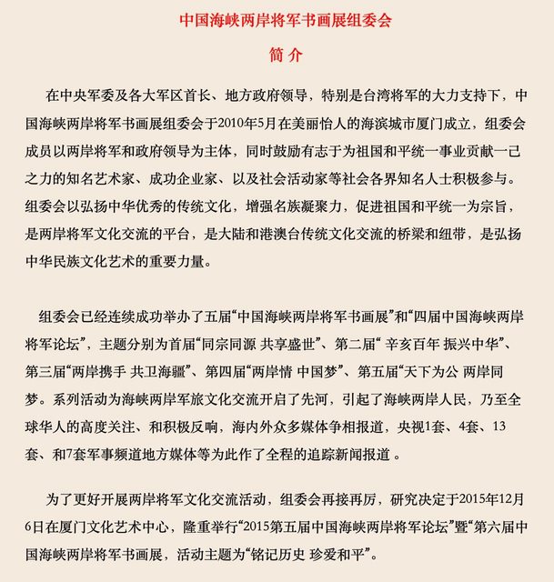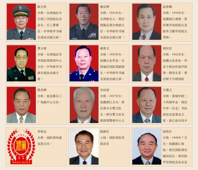 中國海峽兩岸將軍書畫展組委會簡介 2010年,中華將軍書畫交流協會在廈門市思明區誼愛路8號之一亨龍置業二樓208號成立。這 個協會實際上是以公司名義在中國設案,公司名稱為廈門益統文化產業發展有限公司,負責 人為夏曼華,但是這間公司負責人是誰不重要,因為只是作為一個登記人頭使用。 事實上,中華將軍書畫交流協會背景是又紅又專。第一屆組委會主席是朱文泉上將,朱文泉 上將是前全國人大常委、原南京軍區司令員,同時也是前中國新四軍研究會會長。新四軍研 究會並不是一個單純的戰史研究團體,這是由所謂的“紅系血脈”所建立的團體。 延安兒女聯誼會、將軍後代合唱團、開國元勳文化促進會、新四軍研究會、西花廳聯誼會、 紅岩兒女聯誼會、北京西路軍後代聯誼會、東北軍愛國將士後代聯誼會......等等不勝枚舉 。雖然在習近平第二和第三任期後紅系血脈政治權力逐漸崩塌,但是在此前紅系血脈在中國 有非常有力的政治話語權。 中華將軍書畫交流協會章程摘錄 ========== 第一條 中華將軍書畫交流協會是以中國海峽兩岸將軍為主體,海峽兩岸書畫家共同參與組成的專業 性社會團體,是以弘揚傳統優秀的中華文化,推動中華民族覆興大業,增進海峽兩岸同胞“ 五源兩地”血濃於水的民族情感為宗旨。 進一步加強我國社會主義社會、政治、經濟、文化建設,提升中華民族在國際上的地位為使 命,並以搭建兩岸將軍軍旅文化互動平台,增進相互了解,加強民族凝聚力,促進祖國和平 發展為己任的非營利文化藝術交流機構,是繁榮社會主義文藝、發展先進文化的重要社會力 量。 第二條 中華將軍書畫交流協會以十七屆五中全會精神為主體,堅持科學發展觀,堅持貫徹執行黨的 基本路線,堅持文藝為人民服務、為社會主義服務的方向,堅持“百花齊放、百家爭鳴”、 “古為今用、推陳出新”的方針,弘揚主旋律,提倡多樣化,新生藝術規律,廣泛團結、組 織兩岸三地著名軍、地書畫家,為繁榮和發展我國書畫藝術事業,弘揚中華民族優秀傳統文 化,建設社會主義精神文明,為促進祖國的和平發展,為兩岸民眾的福祉而奮鬥不息。 第五條 凡是華人,具有將軍軍銜或相當於將軍軍銜的地方領導,在書畫藝術領域取得較高成就,具 有較高的思想文化素質,符合入會條件,讚成本會章程者,由本人提出申請,兩名本會會員 介紹,經申請人所在的團體會員推薦,報本會批準並履行手續後,可成為本會個人會員。 第九條 本會以最廣泛地團結兩岸三地軍、地書畫家為己任。對會員有聯絡、協調、服務和業務指導 的職責。 第十三條 根據國家政策,積極開展書畫藝術的經營活動,加強基礎建設,努力增強本會的整體實力和 可持續發展的能力,為會員創造良好條件。 第十五條 加強與香港、澳門特別行政區書法團體和書法家的聯系與合作;積極發展與台灣地區以及海 外僑胞中的書畫組織、書畫家的橫向聯系與合作,為弘揚中華民族的優秀文化和促進祖國統 一大業做出不懈的努力。 ========== 從協會章程便可以得知,中華將軍書畫交流協會直接接受中國共產黨指導,甚至發展海外以 及台灣組織是其重要目標。 不管如何這種類型的團體,都不是中華民國退役軍官所該接觸的,但是事實上,台灣退役將 領對於向他人展示拋棄自身信仰的決心卻做得淋漓盡致。 https://i.imgur.com/cAD61AO.jpg