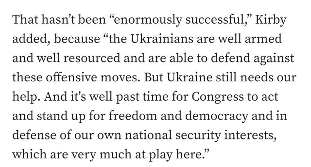Kirby和McCord都敦促國會通過1060億美金的補充國家安全支出法案 其中包括向烏克蘭提供610億美金的軍事援助 拜登政府的補充支出要求還包括對以色列的軍事援助 促進與中國在印太地區競爭的資金 以及美國與墨西哥邊境的安全 由於與共和黨就美國南部邊境的額外安全問題發生爭執,目前這個計畫一直被擱置 Kirby表示在過去24小時內 數十架無人機和至少一枚巡弋飛彈襲擊了烏克蘭城市 基本上是每晚的密集攻擊 並表示俄羅斯沒有取得巨大成功 因為烏克蘭人裝備精良 資源充足 能夠防禦這些進攻行動 但烏克蘭仍然需要我們的幫助 國會早就該採取行動,捍衛自由和民主 捍衛我們自己的國家安全利益 而這些利益在這裡發揮著重要作用 https://i.imgur.com/W90cZiN.jpg