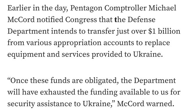 如題啦 美國暫時將不再提供資烏克蘭援助資金 因為白宮國家安全委員會發言人John Kirby對記者表示 目前剩下的資金只夠支付這個禮拜對烏克蘭的另一項援助計畫 我們將不再擁有補給權 今天早上 五角大廈審計長 Michael McCord通知國會 國防部打算從各個撥款帳戶中轉移超過10億美金 來向烏克蘭提供設備和服務 McCord警告說一旦這些資金到位 https://i.imgur.com/plA6SB2.jpg