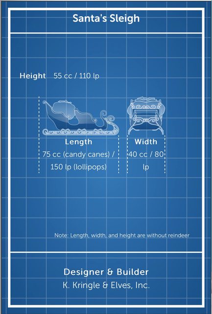 剛剛查到北美防空司令部有公開聖誕老人雪橇的性能諸元 https://www.noradsanta.org/en/sleighinformation 雪橇尺寸:cc(拐杖糖)/ lp(棒棒糖) 長 75 cc / 150 lp 寬 40 cc / 80 lp 高 55 cc / 110 lp備註:長寬高尺寸不包含馴鹿https://i.imgur.com/leN3R5T.jpg