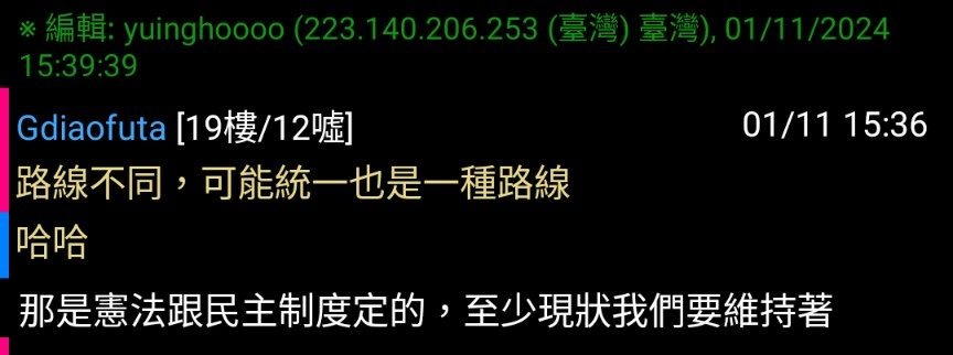 噓 st89702 : 統一什麼時候從獨裁政治宣傳變成民主制度定的了? 01/11 15:49